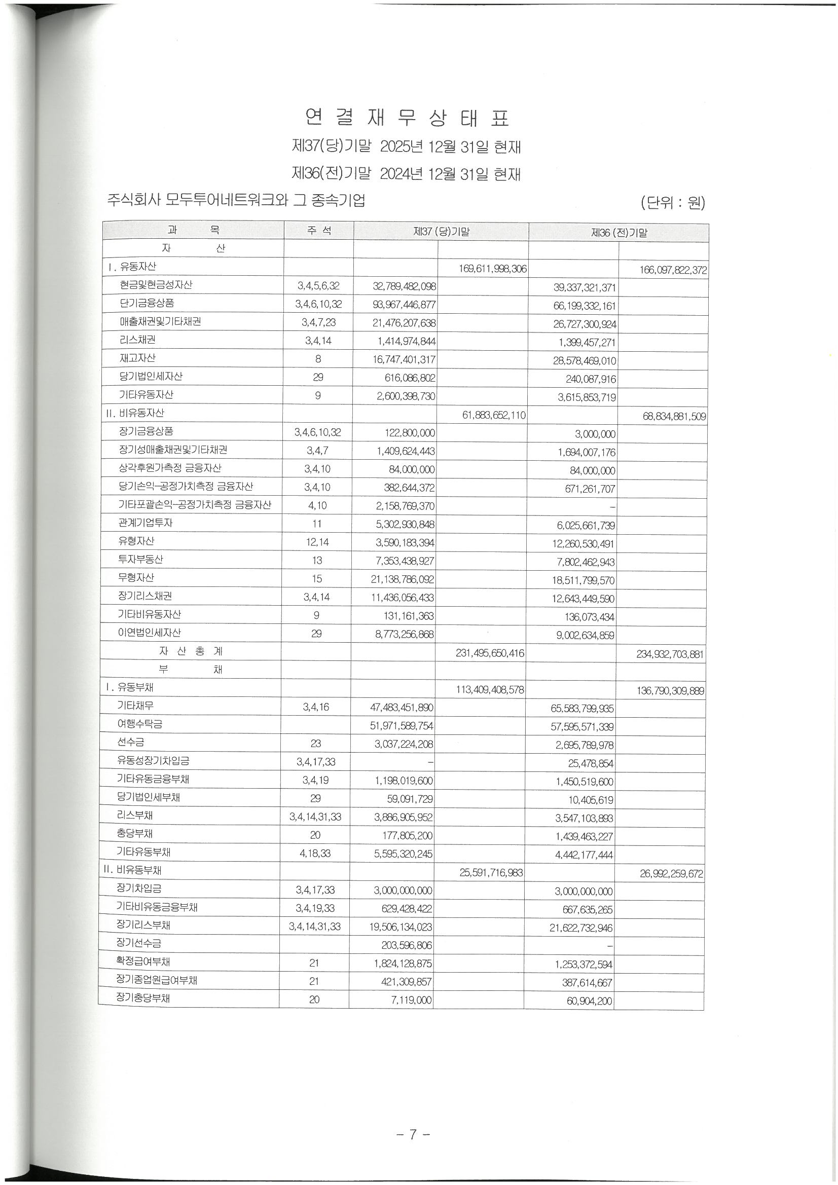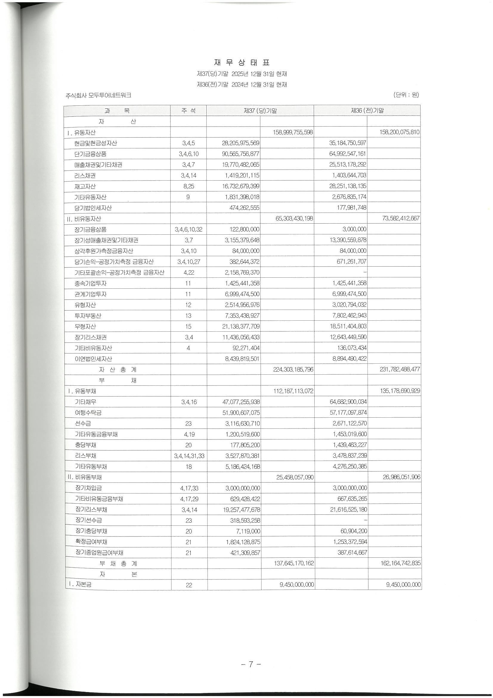 제 37기 주식회사 모두투어네트워크 재무상태표입니다.