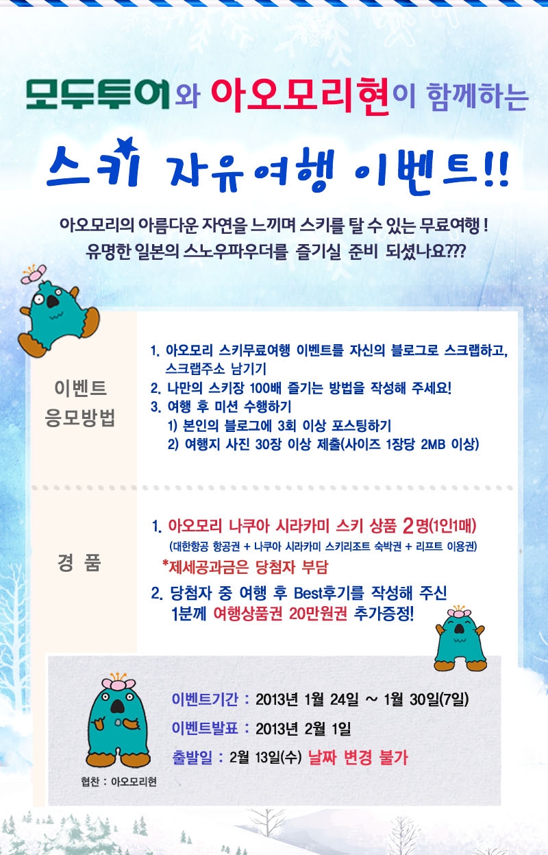 당첨자 발표는 2월 1일 예정이며 당첨된 2명에게 아오모리 나쿠아 시라카미 스키 상품을 제공한다. 상품에는 대한항공 항공권과 나쿠아 시라카미 스키리조트 숙박권, 그리고 리프트 이용권까지 모두 포함되어 있어 그 외 개인 경비만 준비하면 된다. 여행 후에는 간단한 미션을 수행해야 한다. 블로그 포스팅 3회와 여행지 사진 30장 제출이 미션이다.
