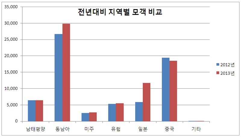 이 같은 해외 송객인원 증가에 가장 큰 원인은 바로 일본지진 기저효과와 엔저에 따른 일본여행객 증가로 볼 수 있다. 일본지역은 3월 74.9% 증가, 4월 76%증가, 5월 83% 증가로 지속적인 상승세를 타고 있으며 특히 지난 6월은 101.3%가 증가해 두 배가 넘는 송객 숫자를 기록하고 했다. 이 같은 상승 분위기가 지속된다면 7,8월 성수기에도 높은 성장을 이룰 수 있을 것으로 기대된다. 아울러 동남아지역이 11.8%, 장거리 노선인 미주와 유럽도 각각 7.6%, 3.5% 증가해 전 지역이 고루 증가했음을 알 수 있다.