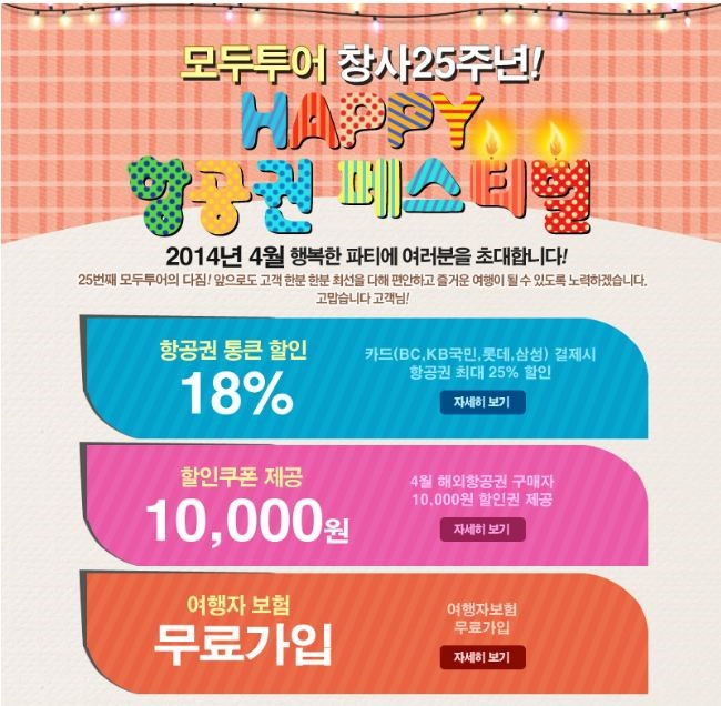 모두투어는 2014년, 창사 25주년 이벤트 중 하나로 4월 한달 동안 해외항공권 구입 시 세가지 특전을 제공한다. 모두투어에서 가격의 차이를 만드는 홀세일 항공권을 이용하여 다양한 특전을 누려보자!