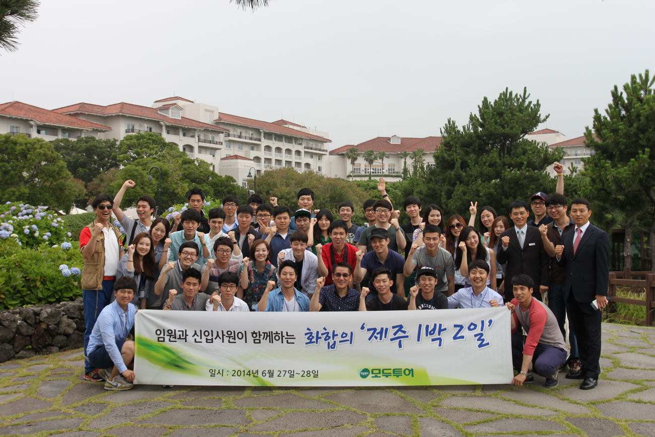 ㈜모두투어네트워크(사장 한옥민)가 지난 27일부터 1박2일간 2014년 4월 이후 입사자 42명과 임원이 함께하는 ‘화합의 제주 1박2일’ 행사를 진행했다.