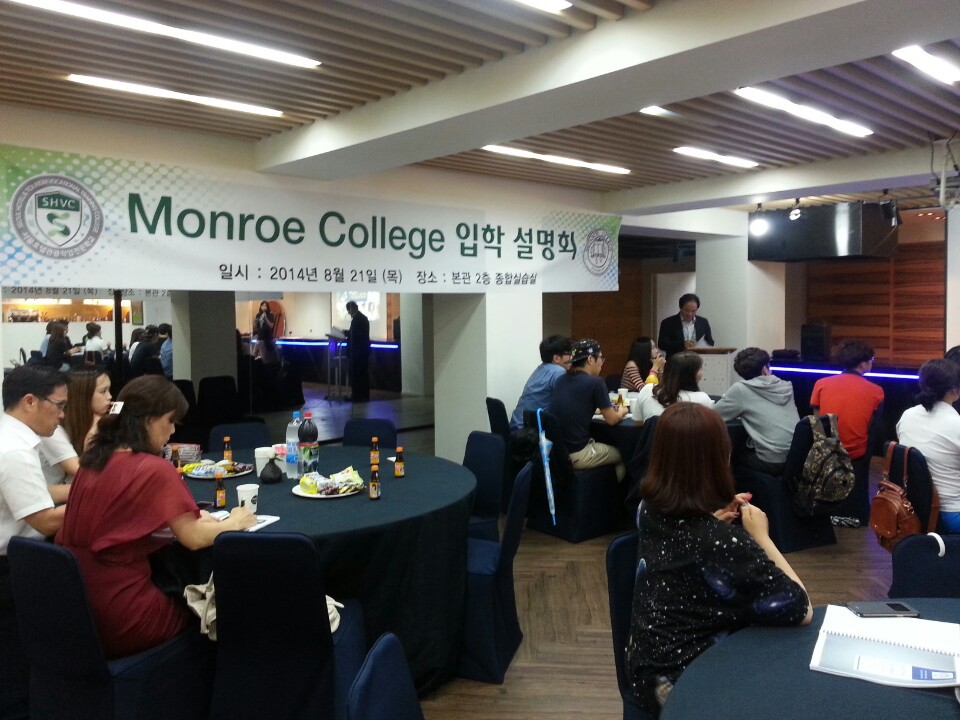 서울호텔관광전문학교(대표 이형근, 이하 호텔학교)에서 Monroe College, NY USA 입학을 위한 학부모 설명회가 지난주 목요일에 개최되었다. 학부모와 학생들은 뉴욕 먼로 컬리지에 대한 소개, 학과별 교육 커리큘럼, ELLI와 EASE 영어프로그램, 학교 입학지원 절차, 비자신청 방법, 비용안내 등 유학시 필요한 전문적인 정보를 제공 받았다.