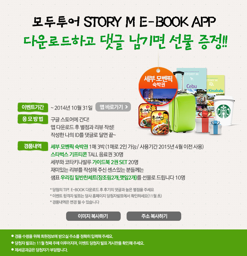 모두투어는 스마트화되어가는 환경에 맞춰, 가이드북을 핸드폰 속에 넣어 가볍게 들고 여행할 수 있도록 여행객 편의를 위한 ‘Story M E-Book APP’을 오픈 하며 이벤트를 준비했다.