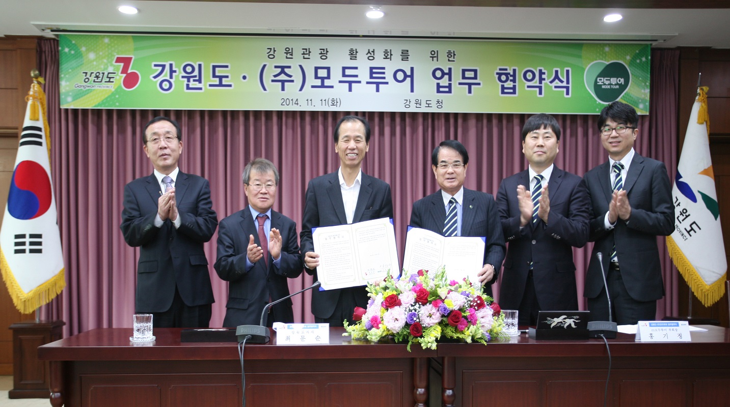 주)모두투어네트워크(사장 한옥민)와 강원도가 11월 11일, 강원관광의 국제화•브랜드화를 위한 강원상품개발을 도모하고자 업무 협약식을 체결했다.