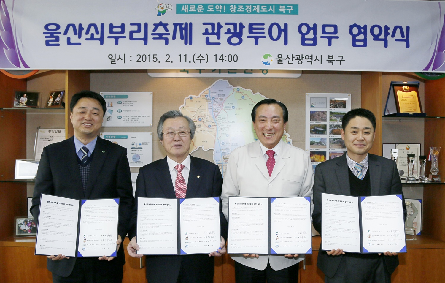 ㈜모두투어네트워크(사장 한옥민)가 11일(수), 울산광역시 북구청과 지역 대표축제인 울산 쇠부리 축제 활성화에 관한 업무 협약을 체결했다. 모두투어 최재용 울산지점장과 박천동 울산 북구청장등이 참석한 협약식에서 모두투어는 울산 북구청과 쇠부리축제 관련 상품을 공동으로 개발하고 홍보해 쇠부리 축제를 지역축제에서 벗어나 국가 대표 산업축제로 발전시킨다는 계획이다.