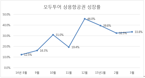 모두투어가 발표한 자료에 따르면 2014년도 전체 상용항공권 발권은 약 40만명으로 전년대비 16%성장했다. 작년 상반기 세월호사고로 위축되었던 여행시장에서 정체양상을 보인 패키지 시장을 감안하면 꽤 높은 성장이라는 것이 관계자의 설명이다. 월별 실적에서도 상용항공권은 작년 하반기 이후 뚜렷한 성장세를 보이고 있다.