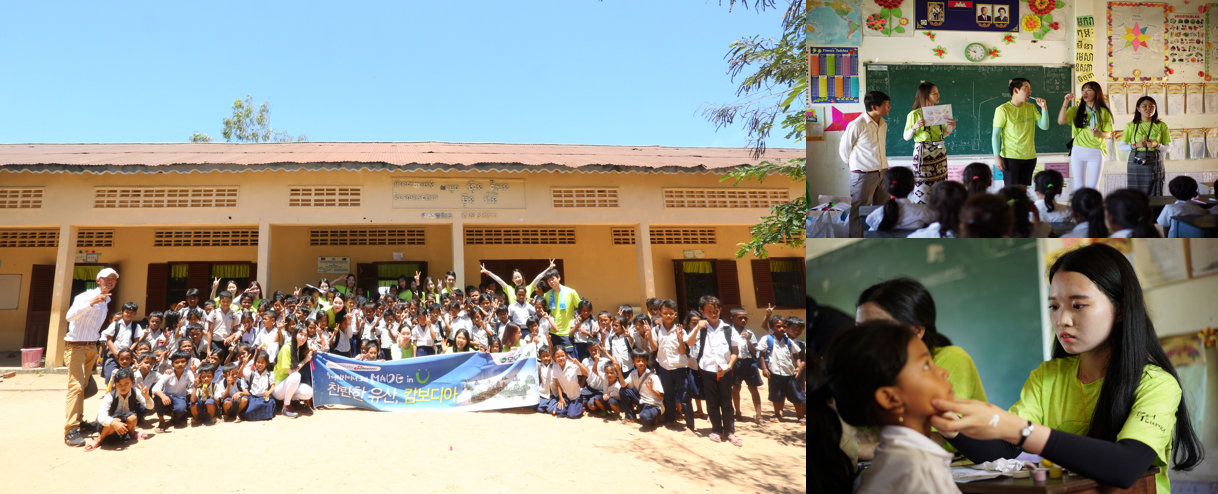 캄보디아에서의 마지막 날에는 사회공헌활동의 일환으로 현지 초등학교 ‘Anchanh Primary School’에 방문하여 투어디자이너들이 초등학생들에게 페이스페인팅, 올바른 칫솔 사용방법 등 간단한 교육을 통한 재능기부와 현지학생들이 필요한 물품을 기부했다.