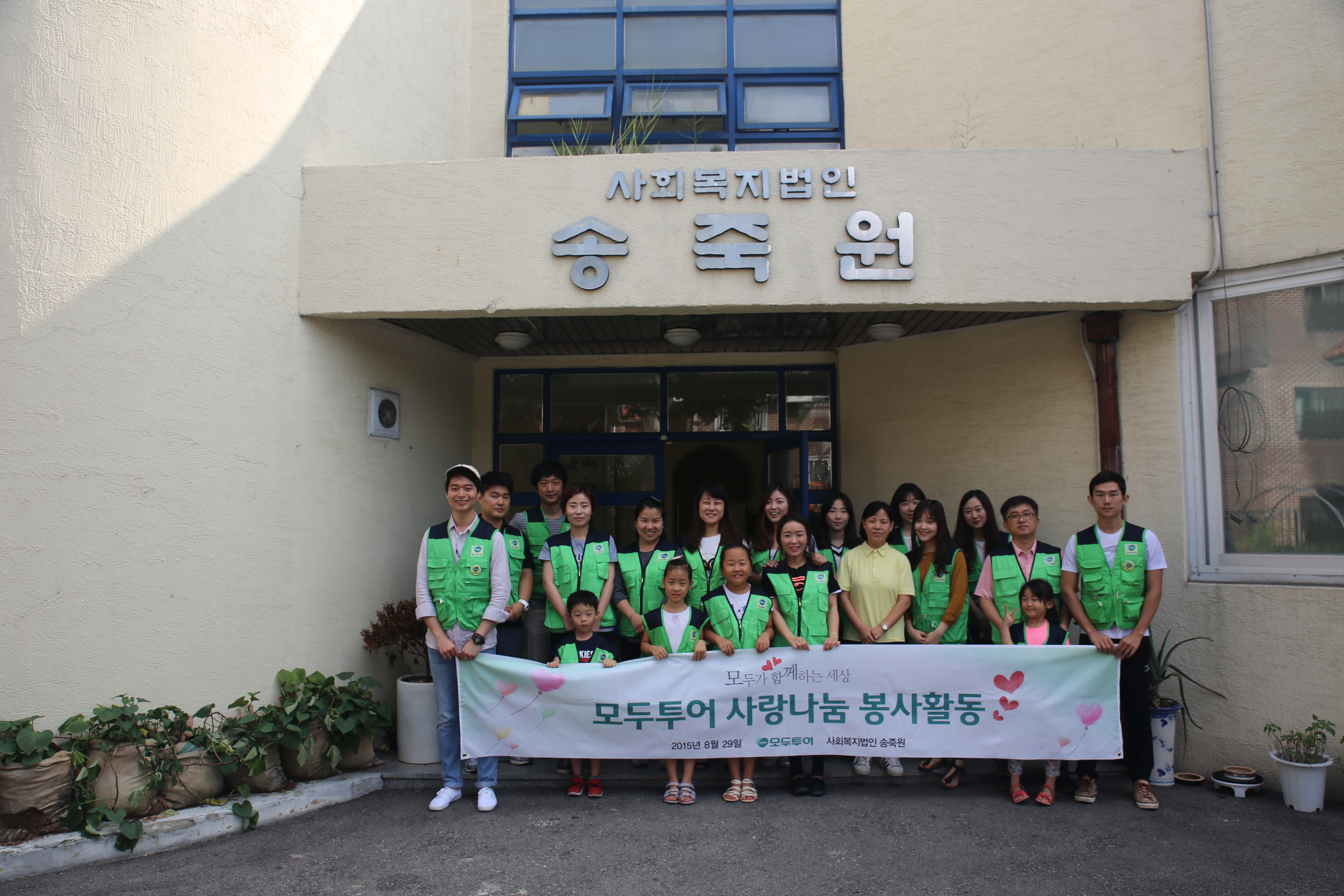 ㈜모두투어네트워크(사장 한옥민)가 홍제동에 위치한 사회복지법인 송죽원에서 사랑 나눔 봉사를 실천했다. 지난 28일(토), 모두투어 임직원과 가족 30여명의 봉사자가 송죽원을 찾아 무더위와 휴가철로 인해 부족한 일손을 보태며 사랑의 온정을 나누었다.