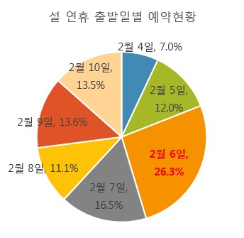㈜모두투어네트워크(사장 한옥민)가 분석한 예약현황에 따르면 연휴가 시작 되는 2월 6일에 출발하는 여행객이 25% 이상을 차지하며 여행객이 가장 많이 몰린 것으로 조사됐다. 뒤이어 5일과 7일로, 예약인원 절반이상이 5일에서 7일, 공항을 빠져나가는 것으로 나타났다. 특이한 점은 8일 출발보다 연휴 막바지인 9, 10 일에 더 많은 여행객이 몰려 연휴 막바지 비교적 저렴한 가격을 선택하는 여행객이 상당수인 것으로 나타났다.