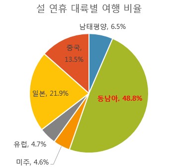설 연휴 대륙 별 선호 여행지에서는 동남아 지역이 절반에 가까운 비율로 1위를 차지했고 단일국가로는 일본이 가장 많은 여행객이 선택한 것으로 나타나 지난해부터 이어온 인기가 설 연휴에도 유효한 것으로 나타났다. 동남아에서는 국가별로 태국을 가장 많이 선택한 것으로 나타났으며 그 뒤를 필리핀, 베트남이 차지했다.