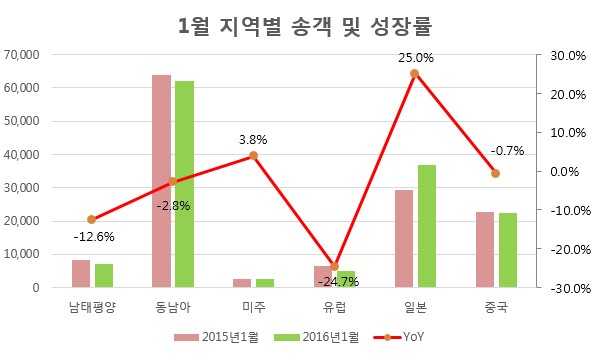 악재로 인한 유럽이 20% 넘는 역성장을 기록하면서도 전체적으로 성장을 이룰 수 있었던 건 여전히 일본이 뜨거운 인기를 누리고 있기 때문인 것으로 나타났다. 지역별로 동남아가 45.7% 비중을 기록했으면 일본이 26.9%로 단일국가 최대 모객을 기록했다.
