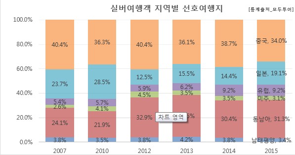 모두투어 자료에 따르면 기존 중국, 일본, 동남아 등의 비교적 근거리 지역을 여행했던 실버세대들은 최근 유럽등의 중장거리 지역으로 까지 여행지역을 넓혀가는 것으로 나타났다. 여행업계 한 관계자는 최근 실버세대들의 여행 패턴이 기존 근거리 패키지 여행에서 점차 중장거리, 개별여행으로 확대되고 있다고 밝히며 실버세대들을 위한 차별화된 상품을 개발하고 있다고 언급했다