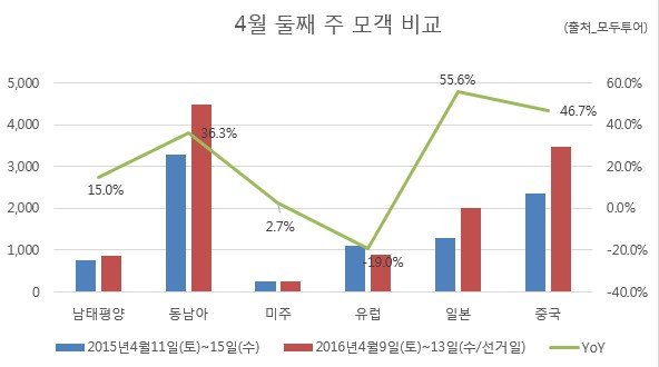 국내 대표여행기업 ㈜모두투어네트워크(사장 한옥민)의 예약현황에 따르면 올해 4월은 13일이 20대 국회의원 선거일로 지정되면서 휴일이 없는 여느 해와 달리 여행객들이 증가하고 있는 것으로 나타났다. 특히나 선거일이 주중 수요일임에도 불구하고 선거일 전 주말을 이용해 해외로 떠나는 여행객들이 증가하고 있는 것으로 조사됐다.