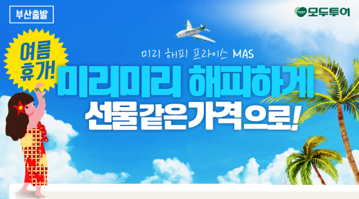 부산출발 전상품을 대상으로 이뤄지는 이번 기획전은 상품명에 미리해피특가 키워드가 들어간 상품은 모두 해당되며, 기본 상품들의 다양한 특전은 그대로 보존하고 지역별 최저가 상품들로 준비했다. 지금 여름 휴가를 계획 중인 고객들에게 절호의 찬스가 될 기획전이다.