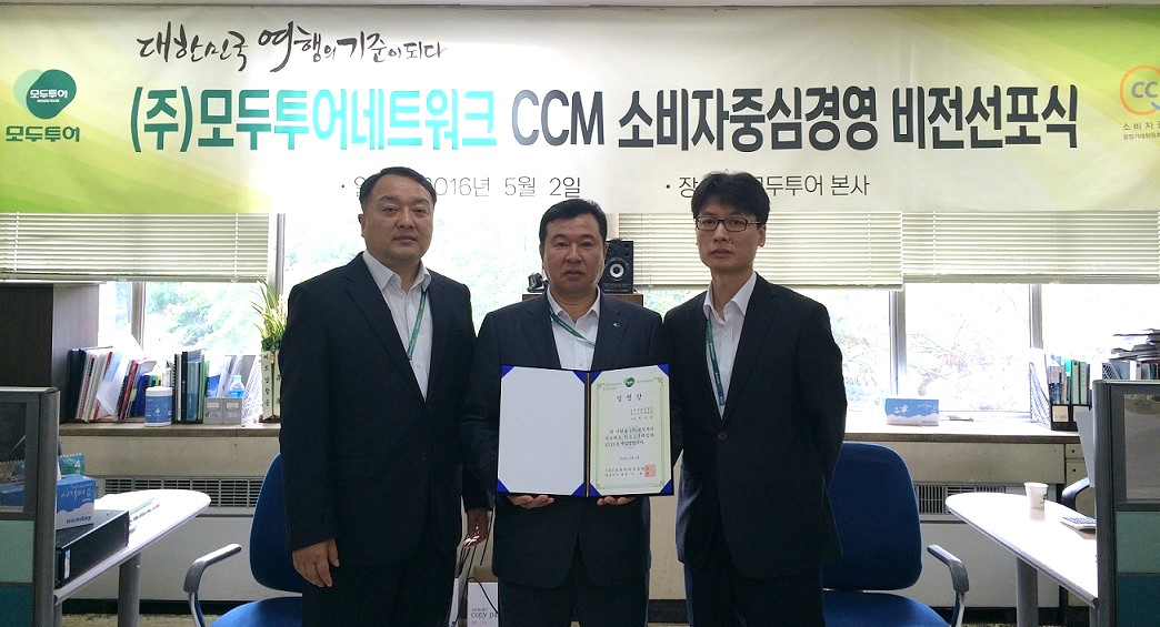 모두투어는 2012년 공정거래위원회의 소비자중심경영(CCM, Consumer Centered Management) 신규인증을 시작으로 2014년 재인증을 받았으며, 한옥민 사장을 최고고객책임자(CCO)로 임명하여 2016년 하반기 인증을 준비하고 있다. 특히, CCM의 확립과 발전을 위해 모두투어가 목표하는 VISION 2020에 핵심가치인 "윤리경영, 고객만족, 동반성장"바탕으로 소비자중심경영을 활발히 이루고 있다.