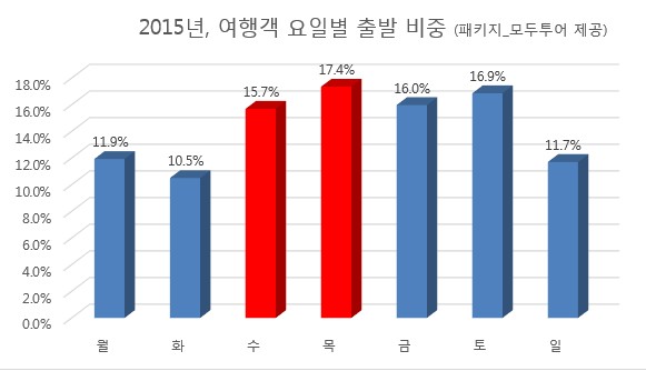국내 대표여행기업 ㈜모두투어네트워크(사장 한옥민, 이하 모두투어)가 2015년 여행객 데이터를 분석한 결과 모두투어에서 출발한 200만명 내외의 전체 여행객 중 패키지는 목요일, 에어텔은 수요일 출발 여행객이 가장 많은 것으로 나타났다.