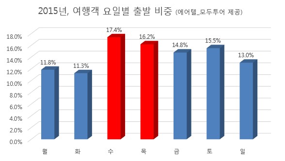 여가 문화 확산으로 주말을 이용한 단기여행객이 증가하면서 수요일과 목요일에 출발하는 여행객 비중이 높은 것으로 나타났다.