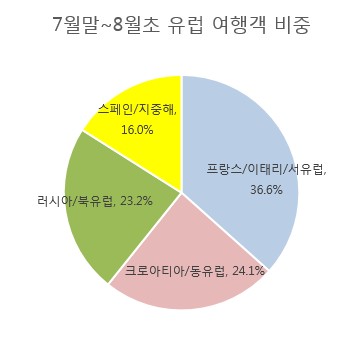 예약이 급증하고 있는 7월말에서 8월초까지의 최고 성수기 시즌, 유럽여행객을 지역별로 분리해 보면 서유럽이 가장 높은 점유율을 기록 했으며 그 뒤로 크로아티아를 포함한 동유럽 과 러시아 북유럽 등으로 조사됐다. 특히나 하계시즌 최고의 인기지역인 러시아와 노르딕(노르웨이,덴마크,스웨덴,핀란드)국가등을 포함한 북유럽이 여행객들에게 높은 인기를 보이고 있다고 관계자는 전했다.