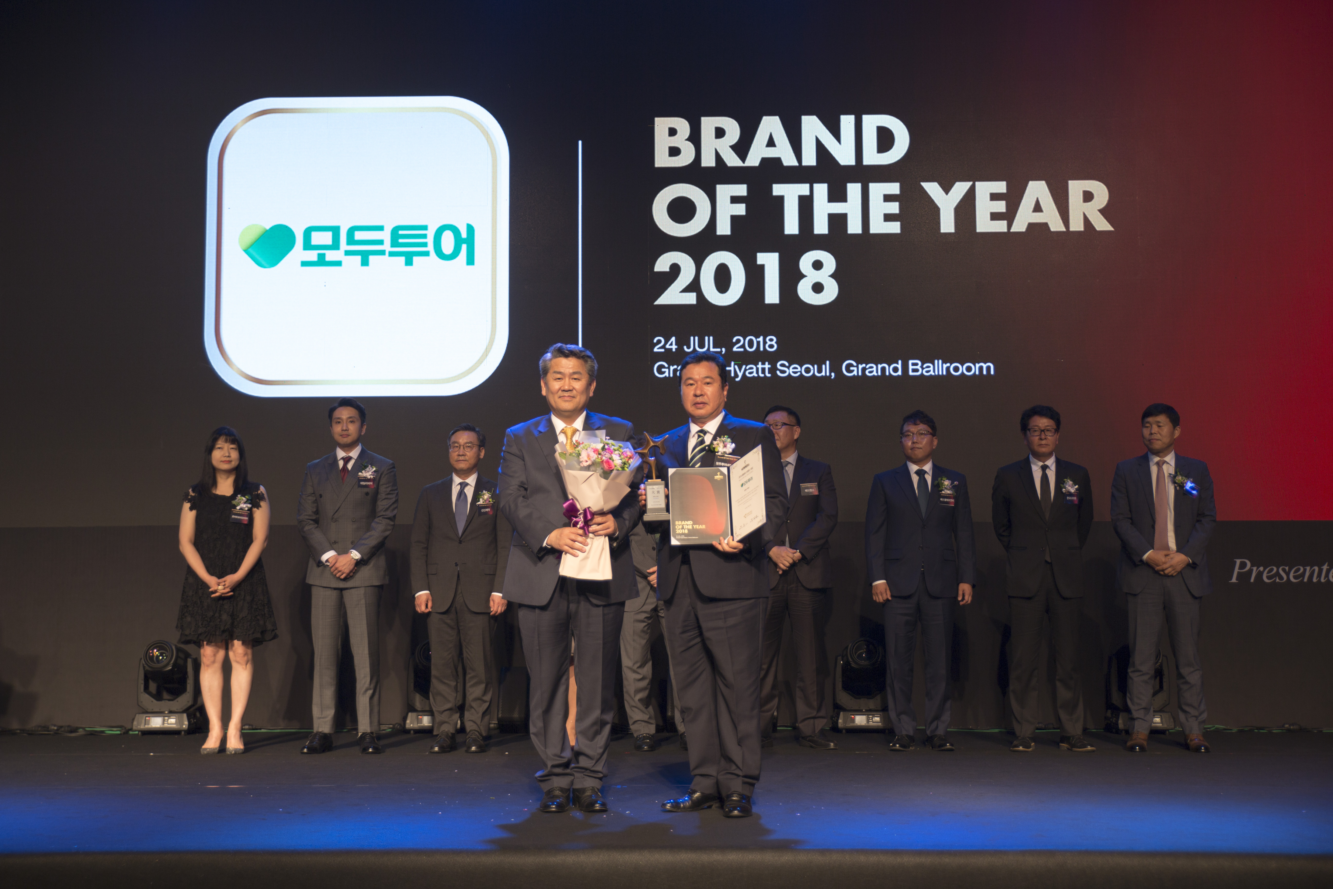 [모두투어 한옥민사장(사진 오른쪽)이 2018 브랜드 대상 시상식에서 수상하고 있다]