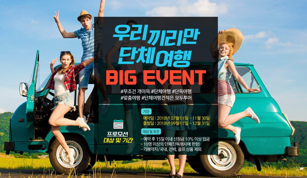 이번 프로모션은 9월 1일부터 연말까지 10명 이상 출발하는 단체에 한해 최고급 여권 파우치를 비롯해 포토북 교환권과 면세점 선불카드 교환권 등을 제공하며, 소중한 추억을 영상으로 남길 수 있는 최신 액션 캠을 팀당 1대 대여해 준다. 또한 상품가의 1%를 모두 마일리지로 고객 대표에게 지급하는 특전도 진행한다.