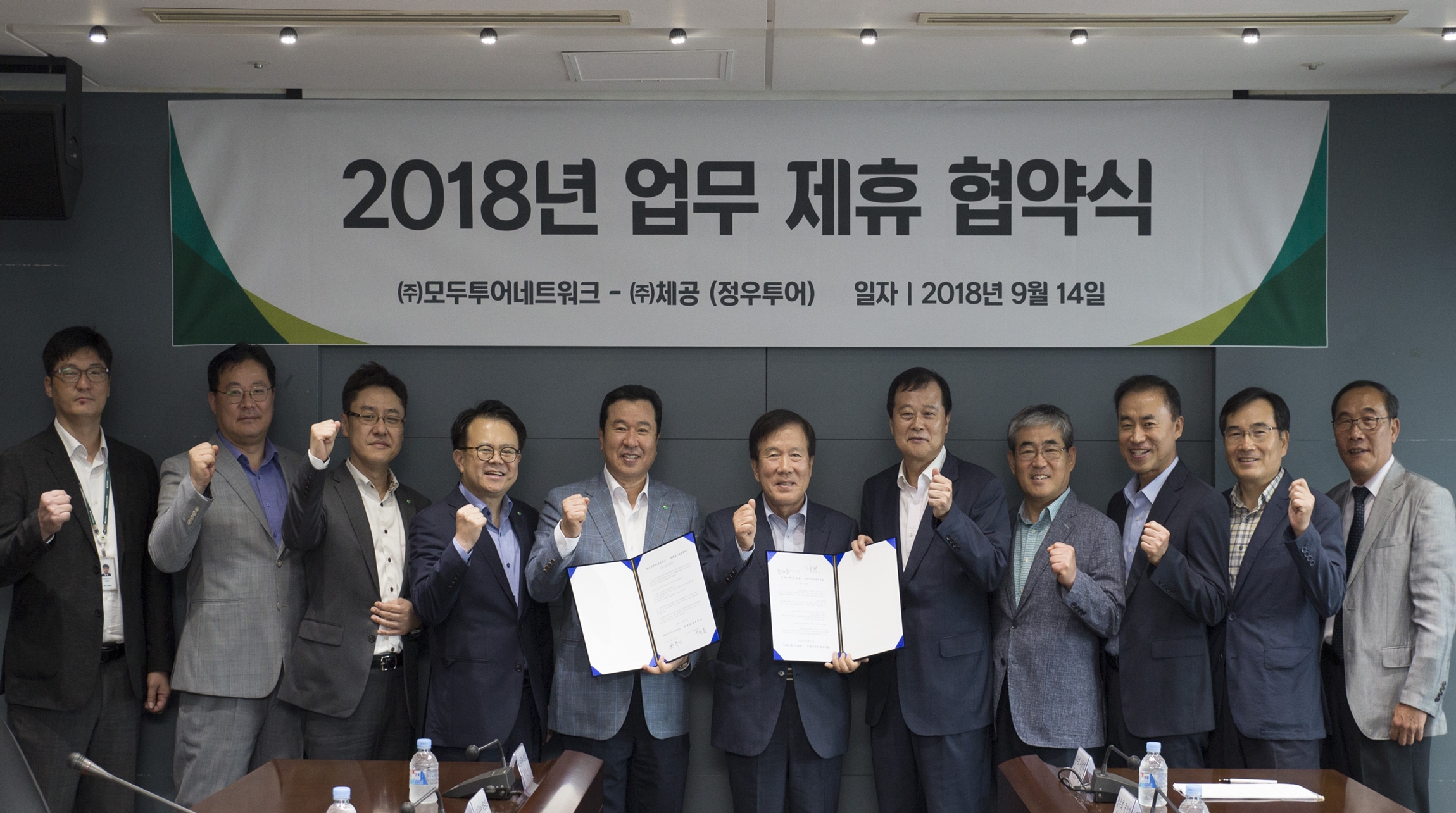 [모두투어(한옥민 사장, 왼쪽 다섯번째)와 ㈜체공(이재륜 사장, 왼쪽 여섯번째)의 정우투어가 업무협약을 체결했다.]