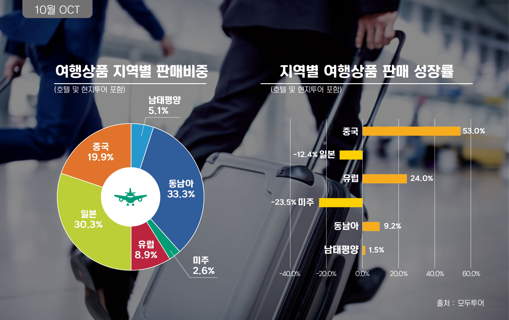 역대 최장 연휴로 호황을 누렸던 지난해 10월과 비교해 성장을 달성했다는 것이 고무적이란 평가속에 여행상품 판매가 9.6 % 성장을 기록하며 시장의 우려 섞인 전망을 불식 시켰다.