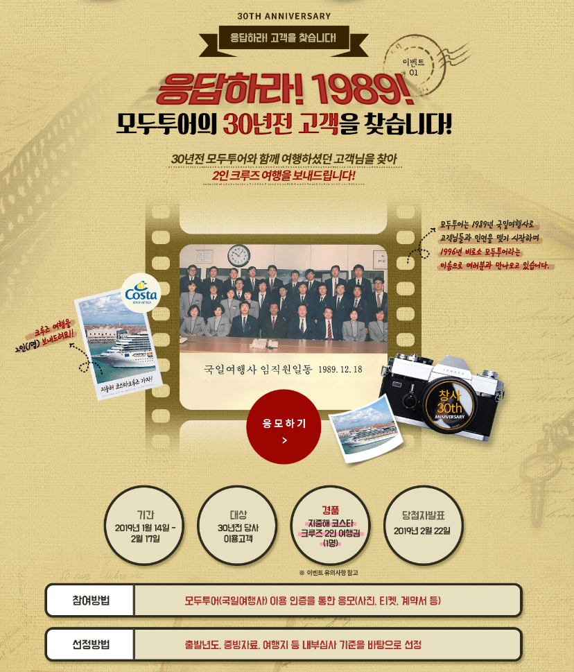 창사 첫 해인 1989년, 모두투어를 통해 여행한 고객을 찾는 ‘응답하라 1989!’에서는 30년전 여행을 증명할 수 있는 사진, 티켓, 계약서 등을 제출하면 심사를 거쳐 크루즈 2인 여행권을 제공한다.