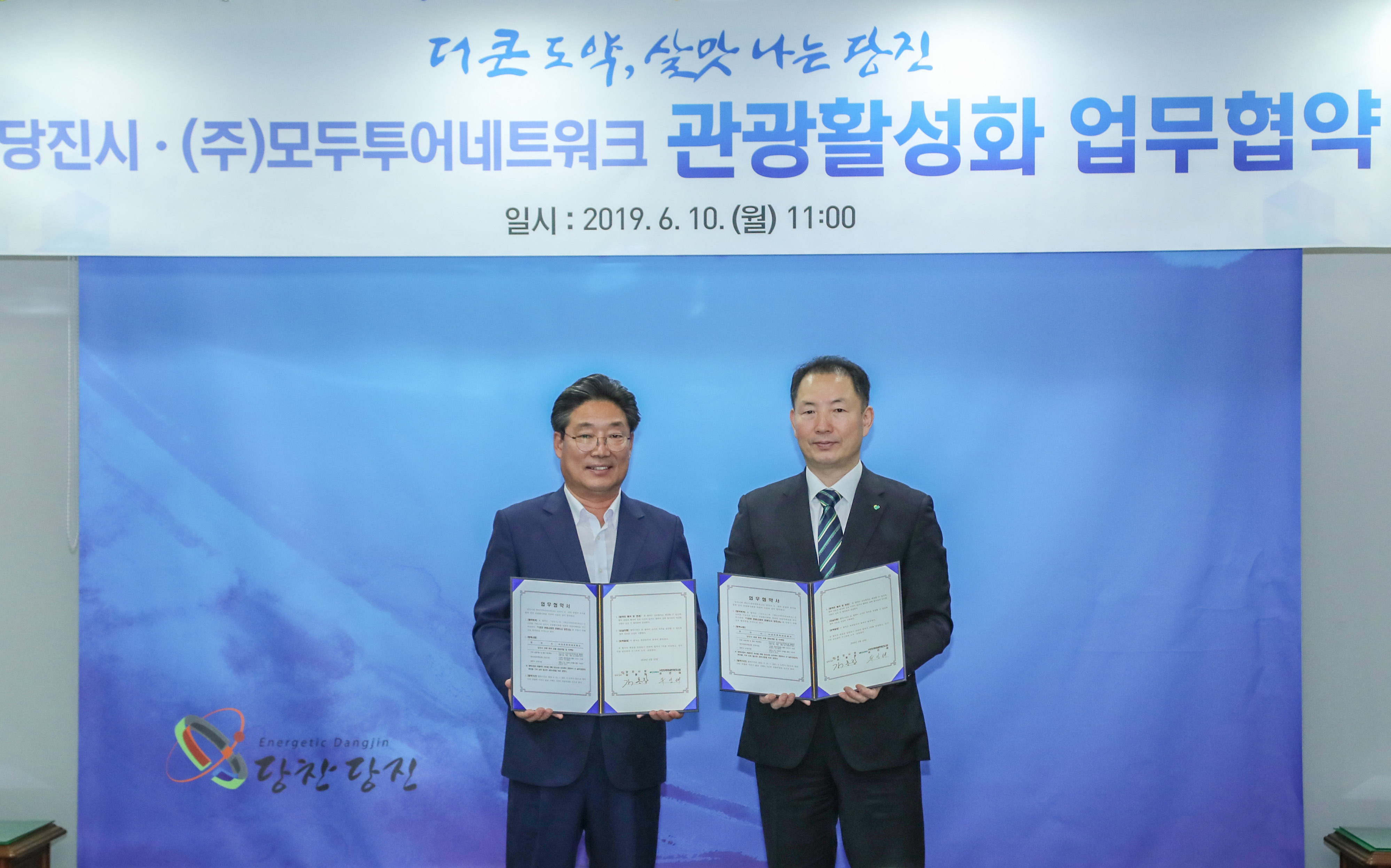 ㈜모두투어네트워크(사장 유인태, 이하 모두투어)가 10일, 충남 당진시와 업무협약(MOU)을 체결했다. 모두투어 유인태 사장과 김홍장 당진 시장이 참석한 협약식에서 양사는 당진시의 자연경관과 역사문화관광 자원을 활용한 다양한 여행상품을 개발해 지역관광활성화와 내국인 관광객 유치에 적극 협력한다는 내용에 합의했다.