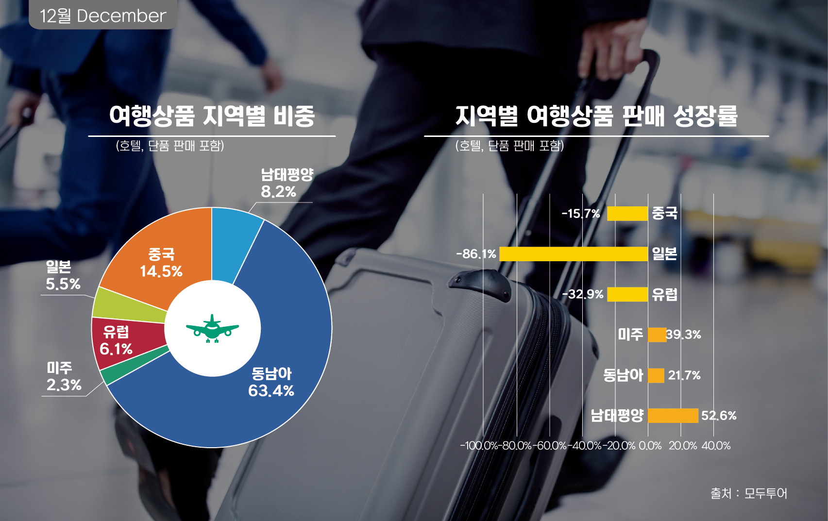 ㈜모두투어네트워크(사장 유인태, 이하 모두투어)가 지난 12월, 12만 4천명의 해외여행(호텔 및 단품 판매포함)과 10만 9천명의 항공권 판매를 기록했다. 호텔과 단품을 포함한 여행상품판매가 마이너스 19%, 항공권 판매가 마이너스 4% 역성장 했지만 지속되는 일본과 홍콩의 악재에도 높은 성장세를 보인 지역이 늘고 있는 것이 특징이다. 특히 주력사업인 패키지상품판매가 일본과 홍콩을 제외할 경우 전년대비 20% 가까운 성장을 기록할 정도로 여행상품 판매가 서서히 회복되고 있다는 것이 관계자의 설명이다.