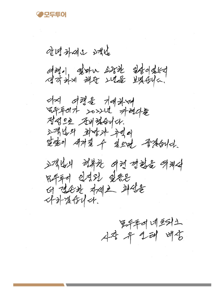 지난 2일 모두투어 유인태 대표가 코로나 상황에서도 잊지 않고 기다려준 고객에게 손편지를 통해 전하는 감사의 메시지이다. 이는 코로나 공백 이후 다시 만나게 될 고객들에게 진정성 있는 브랜드로 거듭나고자 하는 서비스 비전을 약속하고 직원들에게는 다시 한번 마음가짐을 새롭게 하자는 의지로 풀이된다. 아울러 일상의 소중함과 코로나를 잘 극복한 고객에게 진정성 있는 응원의 메시지도 잊지 않았다. 손편지는 2022년 달력과 함께 고객들에게 순차적으로 배송될 예정이라고 밝혔다.