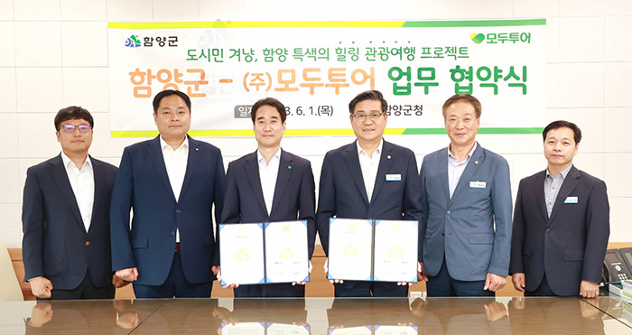 모두투어는 6월 1일 경남 함양군과 함양만의 특색이 가득 담긴 웰니스 관광 여행 상품 개발 프로젝트 추진을 위한 업무 협약식을 개최했다고 2일 밝혔다.
