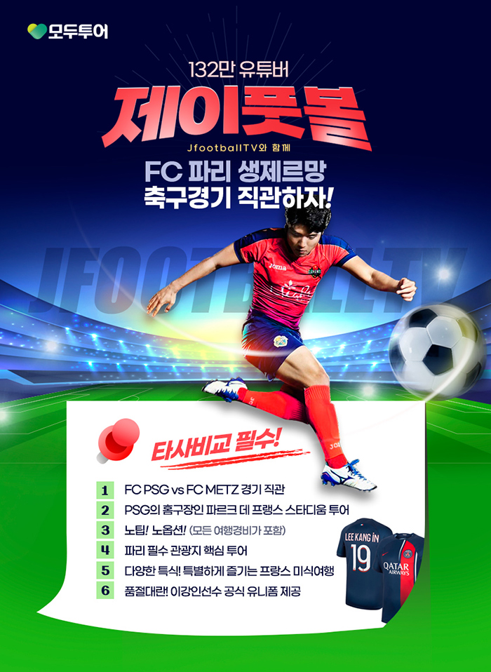 모두투어는 MZ 세대를 겨냥해 구독자 135만의 유명 축구 유튜버 '제이풋볼 JFootballTV'와 함께 떠나는 'PSG 경기 직관 투어 모두픽 파리 6일' 상품을 출시했다고 31일 밝혔다.