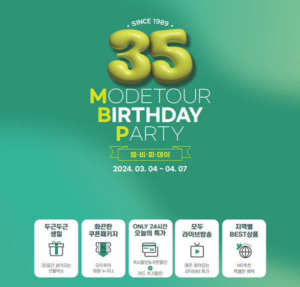 3월 4일부터 4월 7일까지 총 35일간에 걸쳐 진행되는 이번 창사 특선 프로모션은 35주년을 맞은 모두투어가 고객 감사와 도약의 메시지를 담아 다양한 특별 기획 상품과 풍성한 할인 혜택의 이벤트로 구성했다. '엠·비·피데이'란 'M'odetour 'B'irthday 'P'arty를 뜻한다.