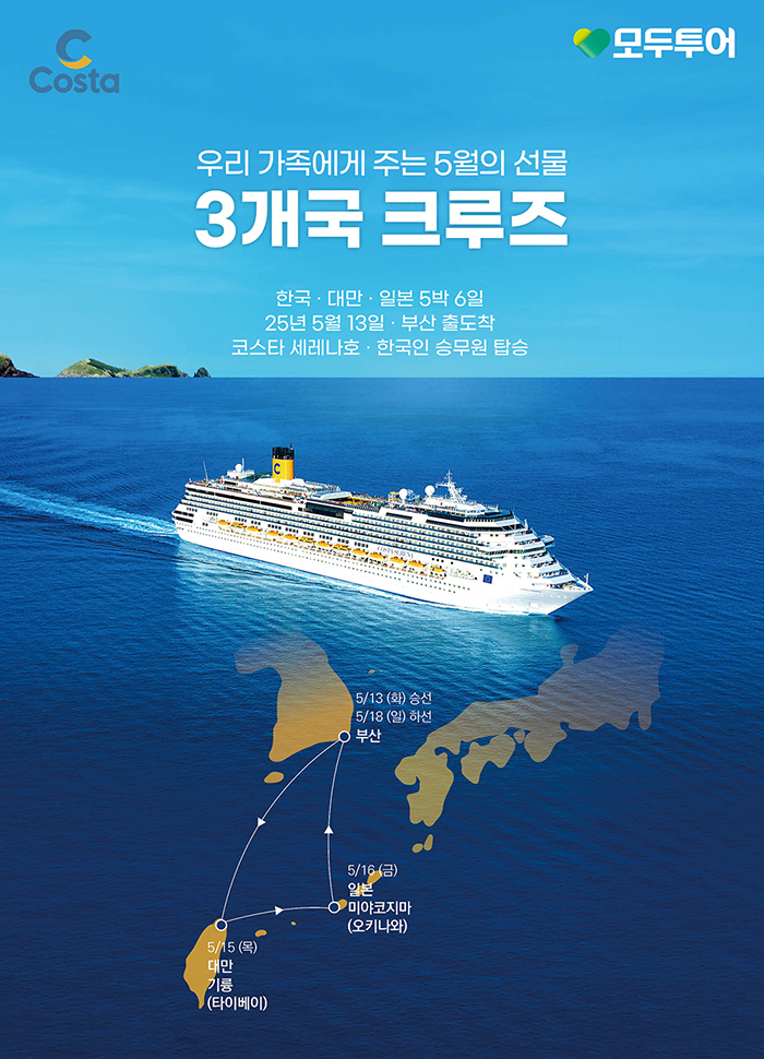 이번 특별 크루즈 상품은 5월 13일, 부산에서 출발해 대만 타이베이와 가까운 위치에 있는 기륭과 일본 오키나와의 미야코지마 섬을 거쳐 다시 부산으로 돌아오는 5박 6일 일정이다. 대만의 아류해양공원, 지우펀 등과 미야코지마의 열대식물원, 해중공원 등 인기 관광지를 한 번에 둘러볼 수 있다.
