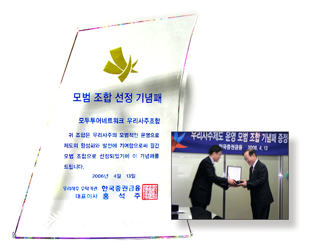 모두투어 우리사주 조합은 2004년 9월에 설립되었으며, 현재 한채경 조합장을 비롯해 468명의 근로자가 조합원으로 등록되어 있으며 발행주의 11.8%를 보유하고 있는데 이는 최대 주주가 보유하고 있는 지분율과 비슷하다. 모두투어의 우리사주는 현재 전담 관리 기관인 한국 증권 금융에서 예탁하고 있다. 이번 수상식에는 모두투어를 비롯해, 고려시멘트, 현대 오토넷, 강원랜드, 시흥캅셀도 기념패를 수상했다. |