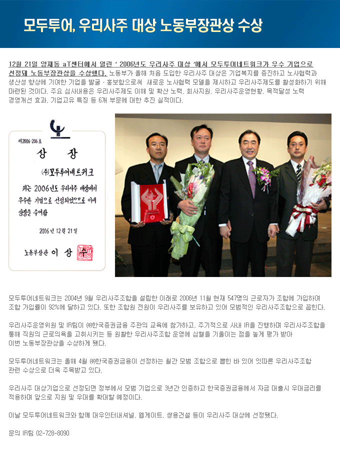 모두투어, 우리사주 대상 노동부장관상 수상