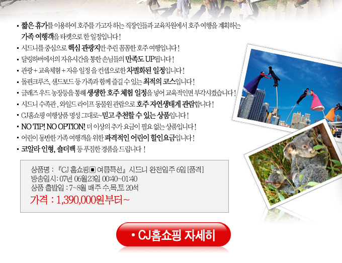 시드니완전일주 CJ홈쇼핑 전격방송!! <font color='ff0000'>-마감-</font>