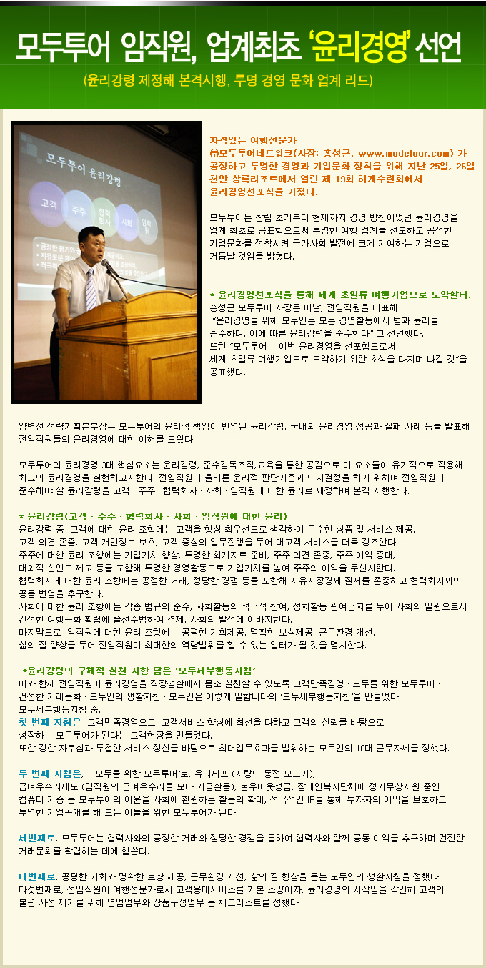 모두투어 임직원, 업계최초 '윤리경영'선언