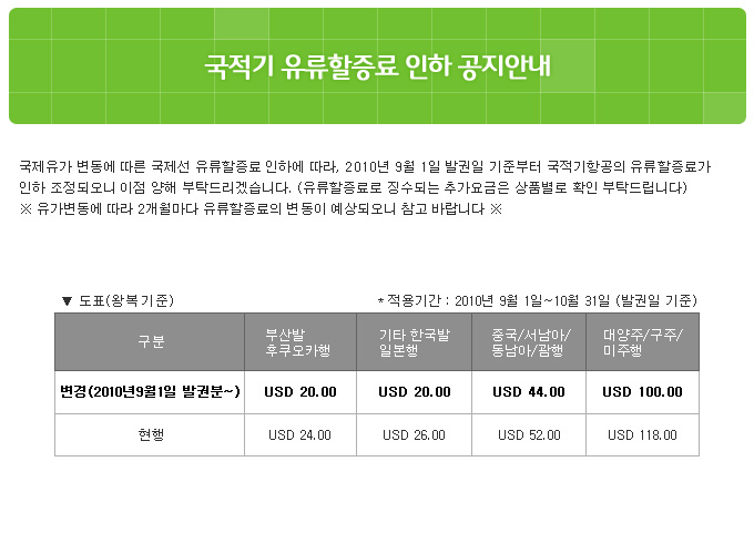 국적기 유류할증료 인하 공지안내(적용기간 : 2010년 9월 1일~10월 31일)