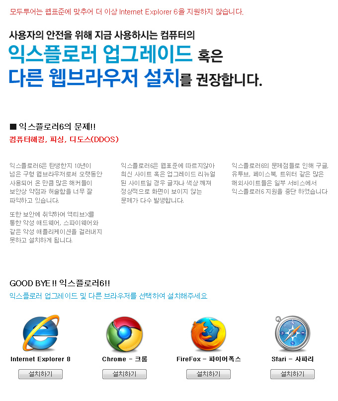 모두투어는 웹표준에 맞추어 더 이상 Internet Explorer 6을 지원하지 않습니다