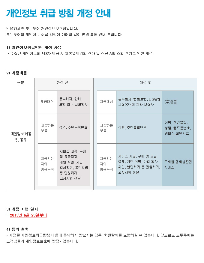 개인정보 취급 방침 개정 안내