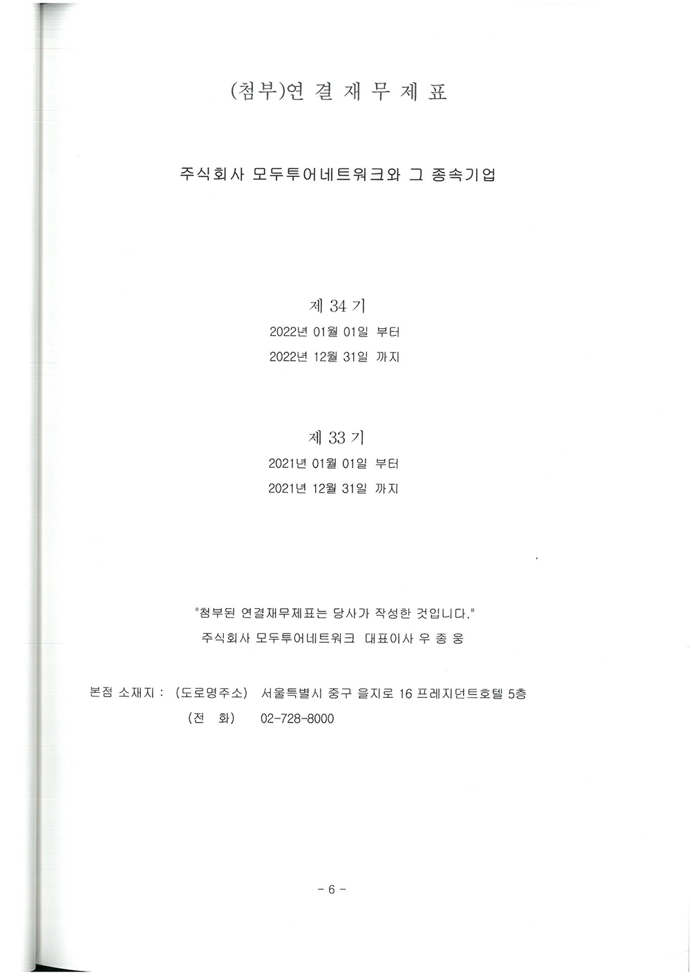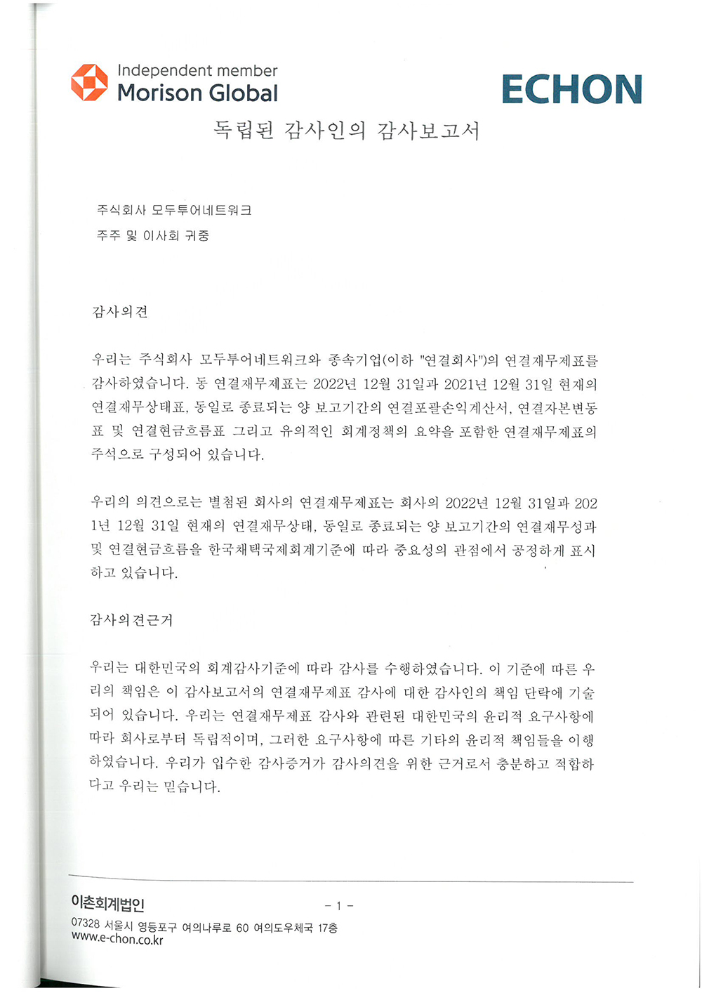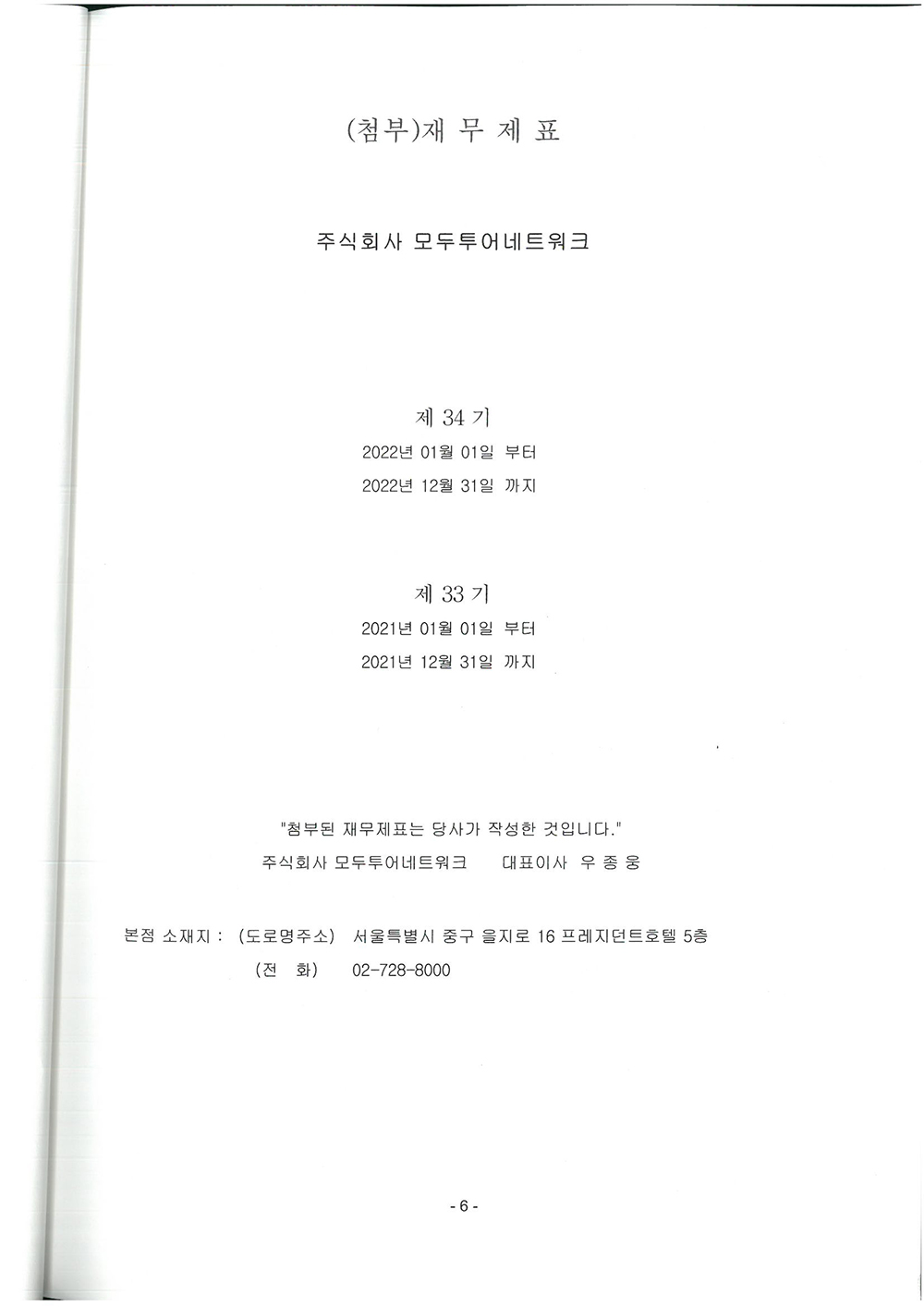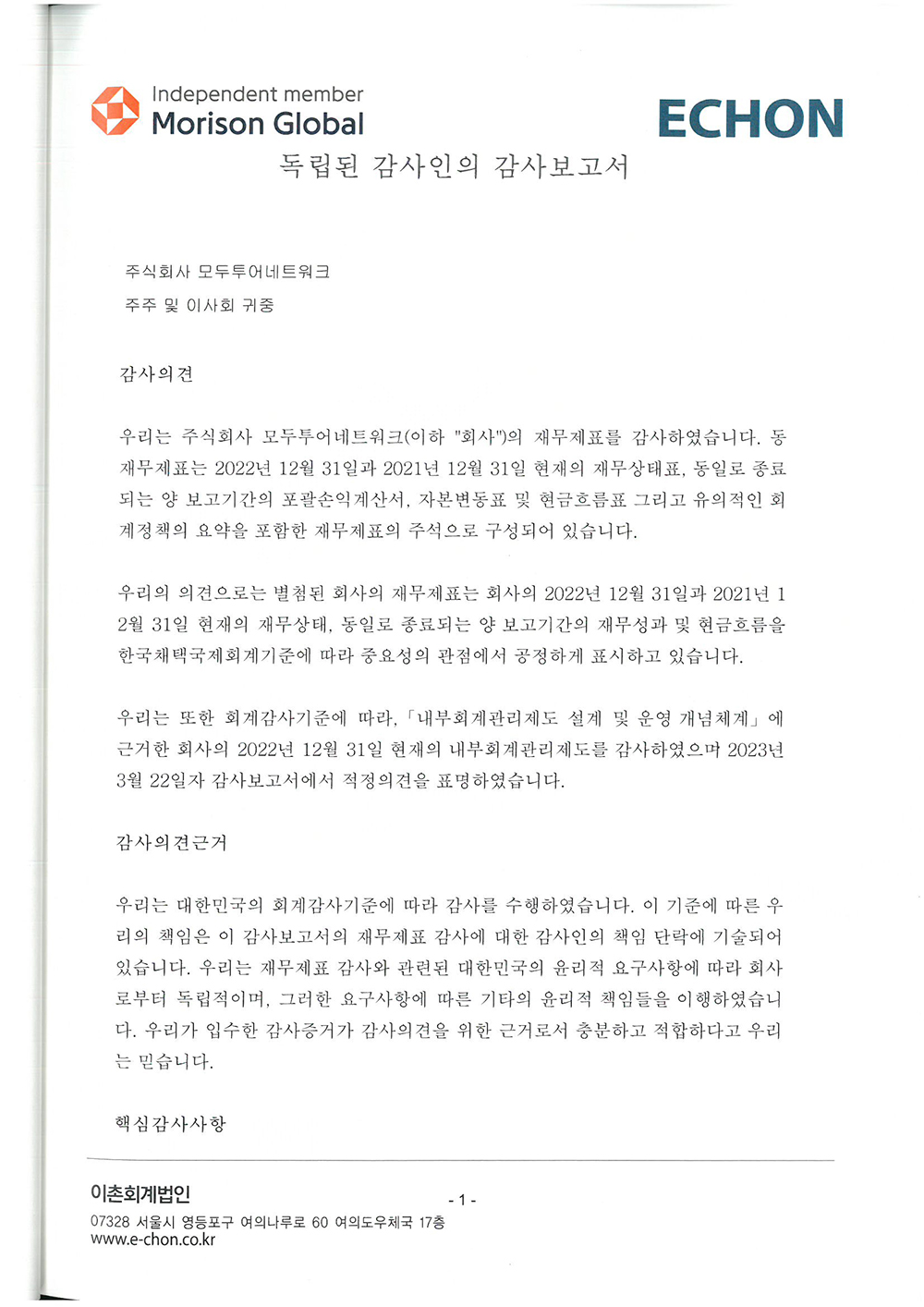 제 34기 주식회사 모두투어네트워크 외부감사인의 감사의견과 재무상태표입니다.