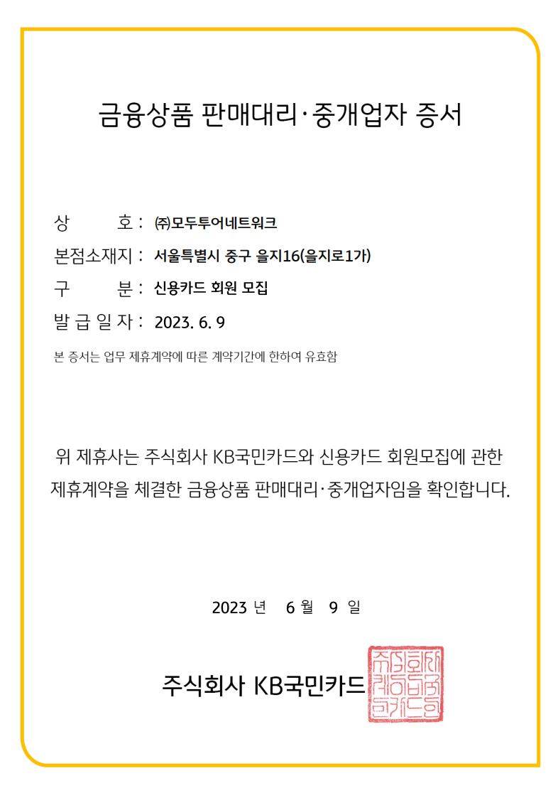 금융상품 판매대리 중개업자 증서(KB국민카드)