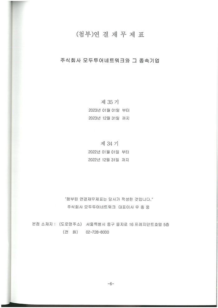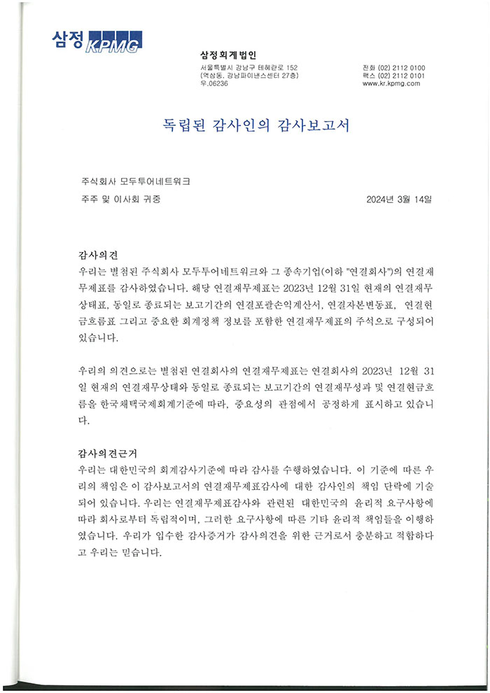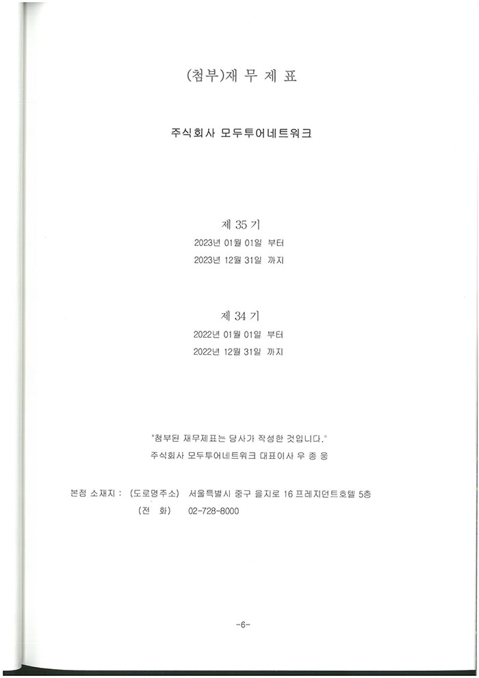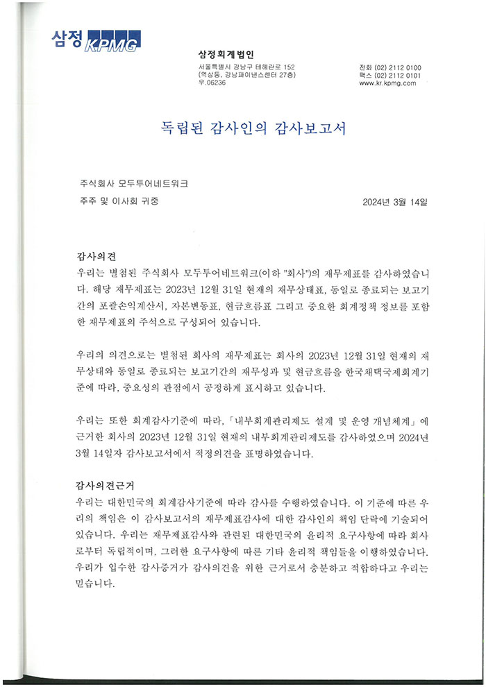 제 35기 주식회사 모두투어네트워크 외부감사인의 감사의견과 재무상태표입니다.